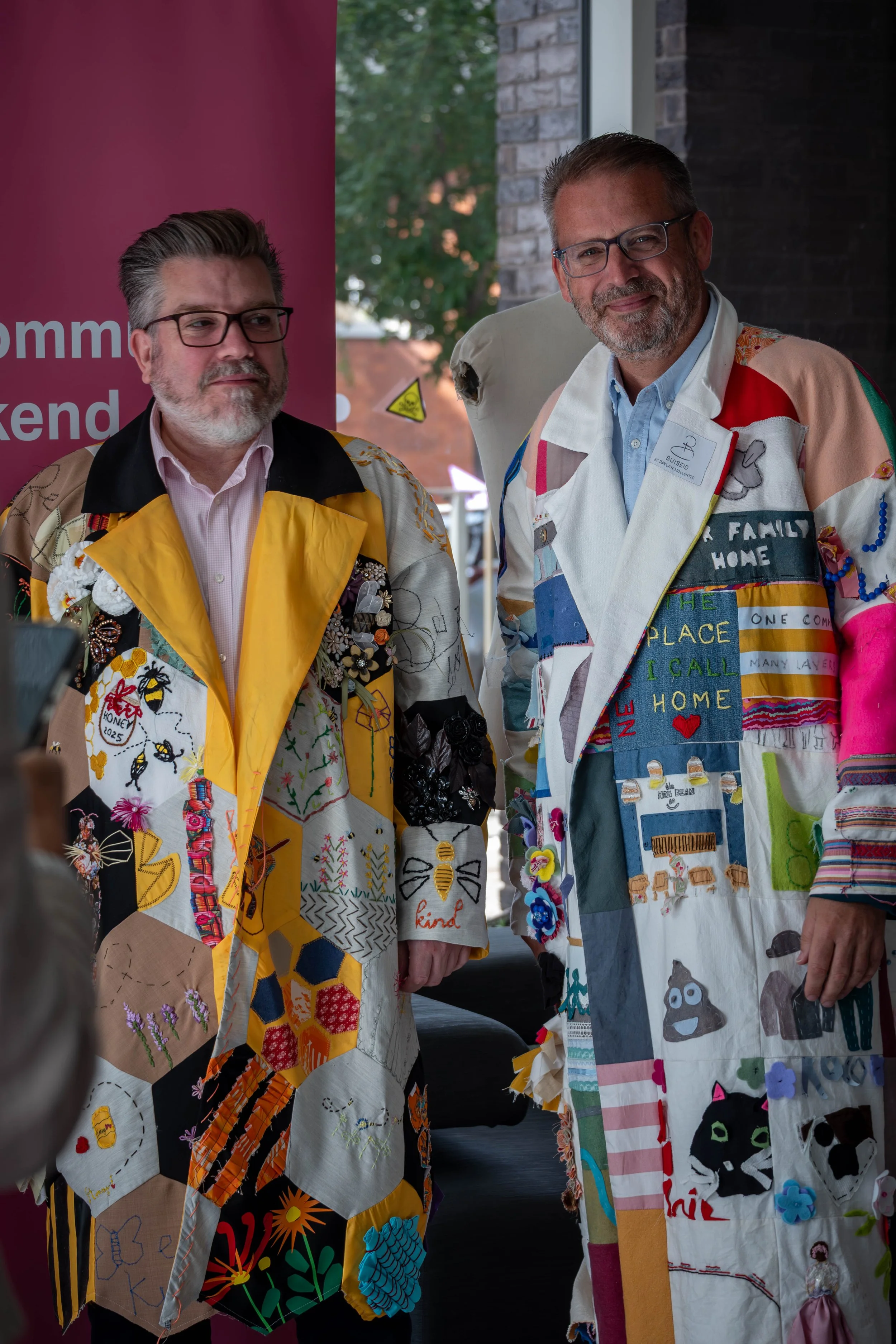 Our ‘Cento’ range of community coats are hand-crafted, wearable artworks made collectively by docklands residents. They are created from individual patches, each one hand worked by a local community member. Through their design, these coats tell stories that resonate with the local community and the events that shape their lives. Participants contribute drawings, words, patterns, symbols, and textiles reflecting personal memories, shared histories, and hopes for the future. These ideas are then stitched, painted, printed, and layered onto the coats, turning them into rich, tactile story-objects rather than conventional garments.