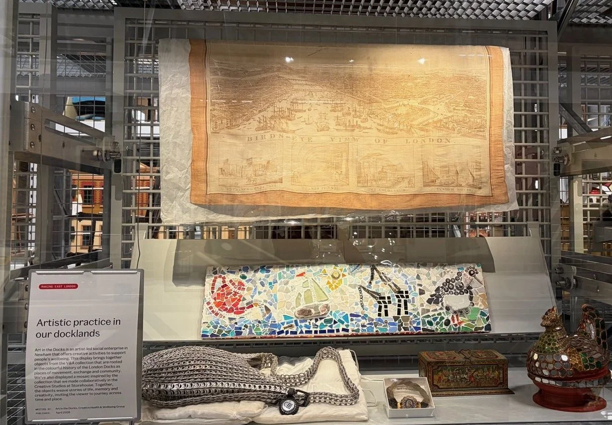 Led by socially engaged scholars and academics from UCL’s MASc Creative Health programme, this co-produced project brings together a group of non-professional creative participants in Art in the Docks Creative Health programme, with a unique opportunity to access and engage with the V&A’s collections at V&A East Storehouse. In collaboration with museum staff, participants explored archival objects, developed a shared curatorial theme, and translated their ideas into a curated display and a mosaic artwork inspired by their research and discoveries.