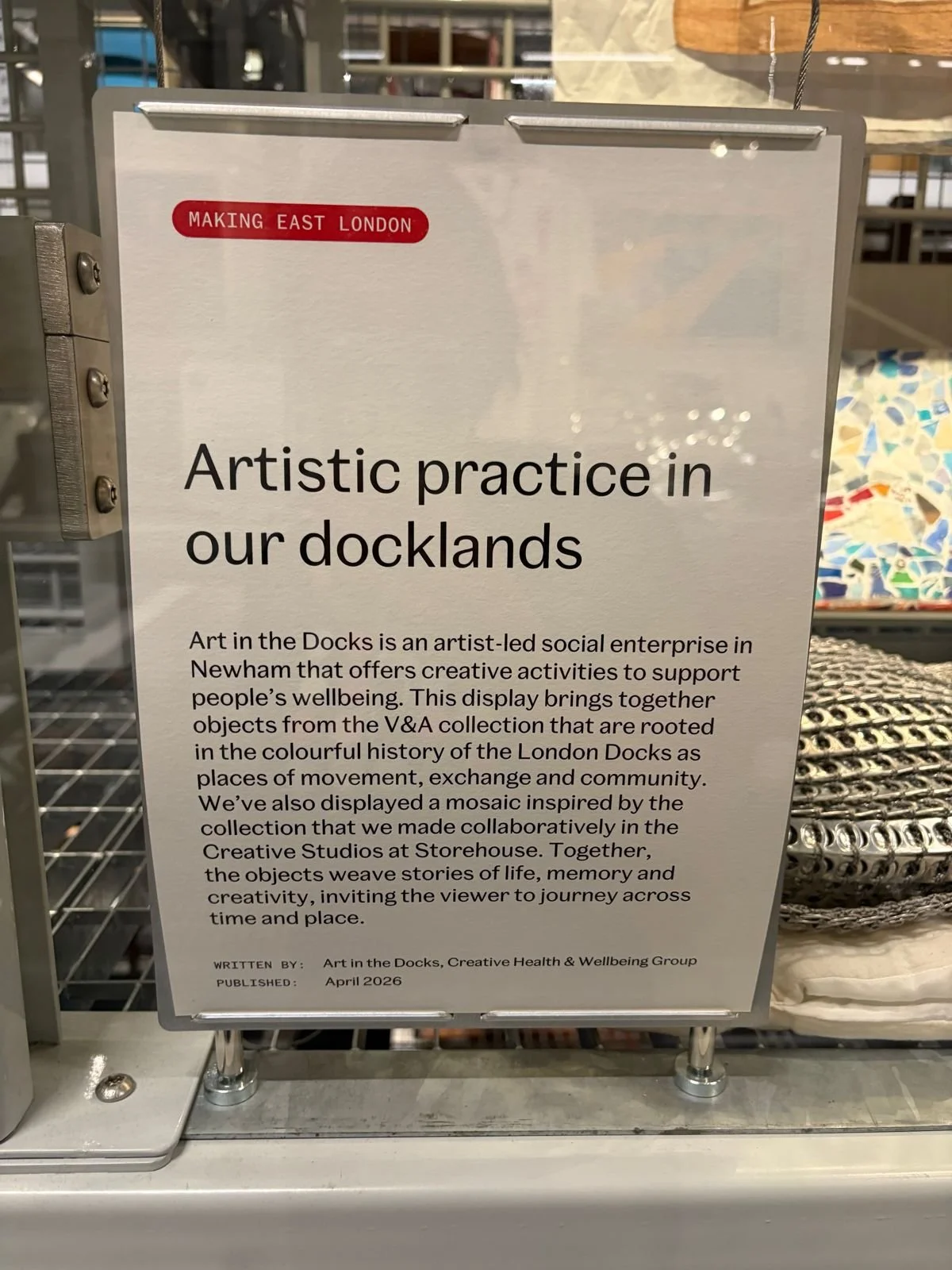 In a new Creative Health partnership between the Faculty of Arts and Humanities at University College London (UCL), Art in the Docks and the V&A (Victoria and Albert Museum) East Storehouse, a group of Newham residents were enabled to co-curate a public display and collectively create an original artwork for the V&A East Storehouse. The display will open on18th April 2026, coinciding with the launch of the new V&A East.