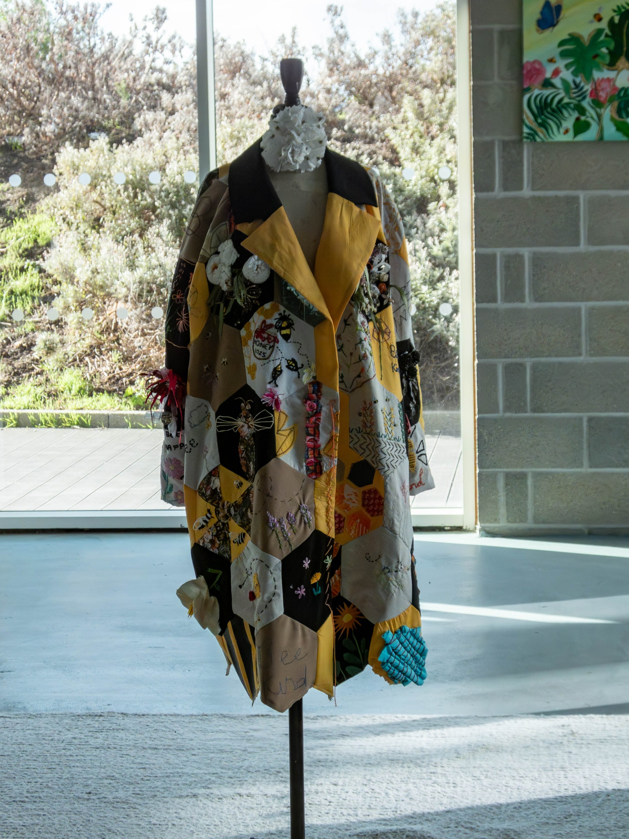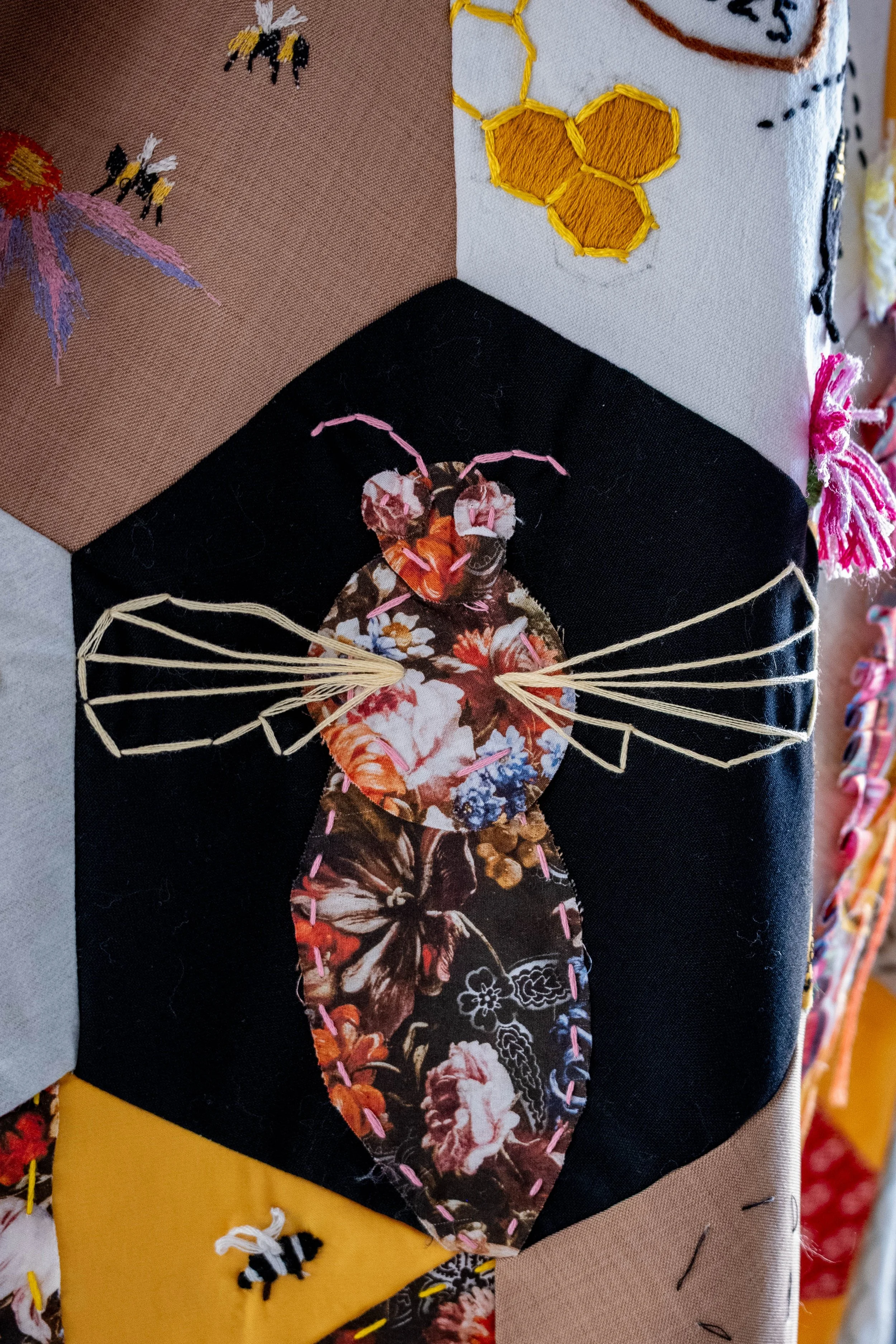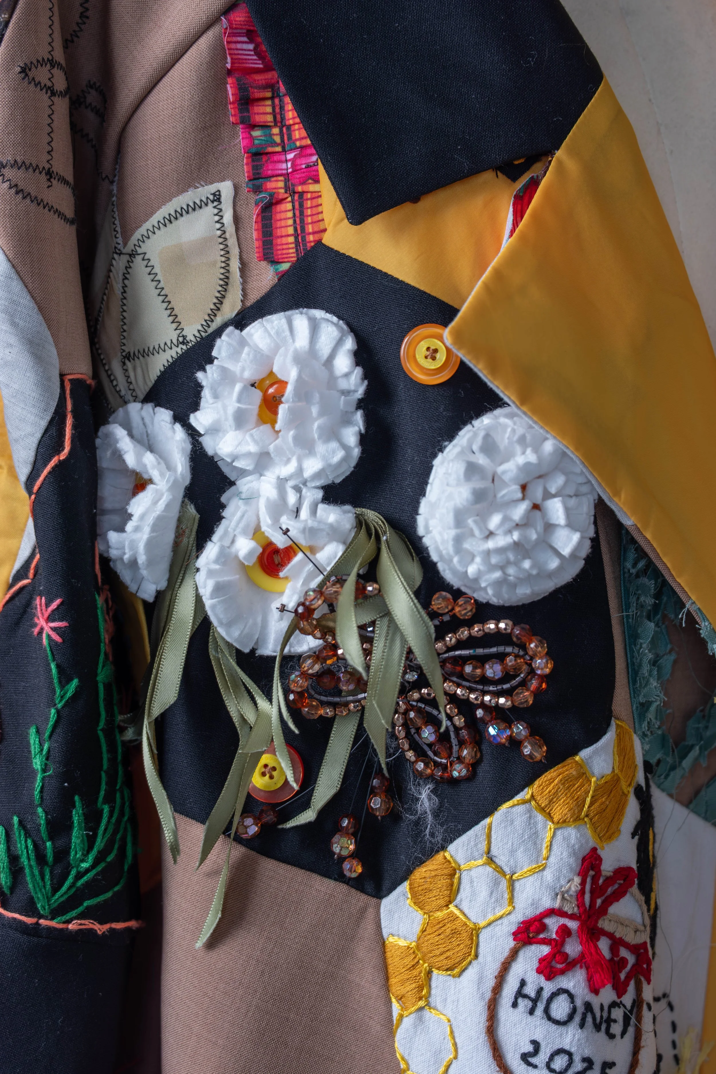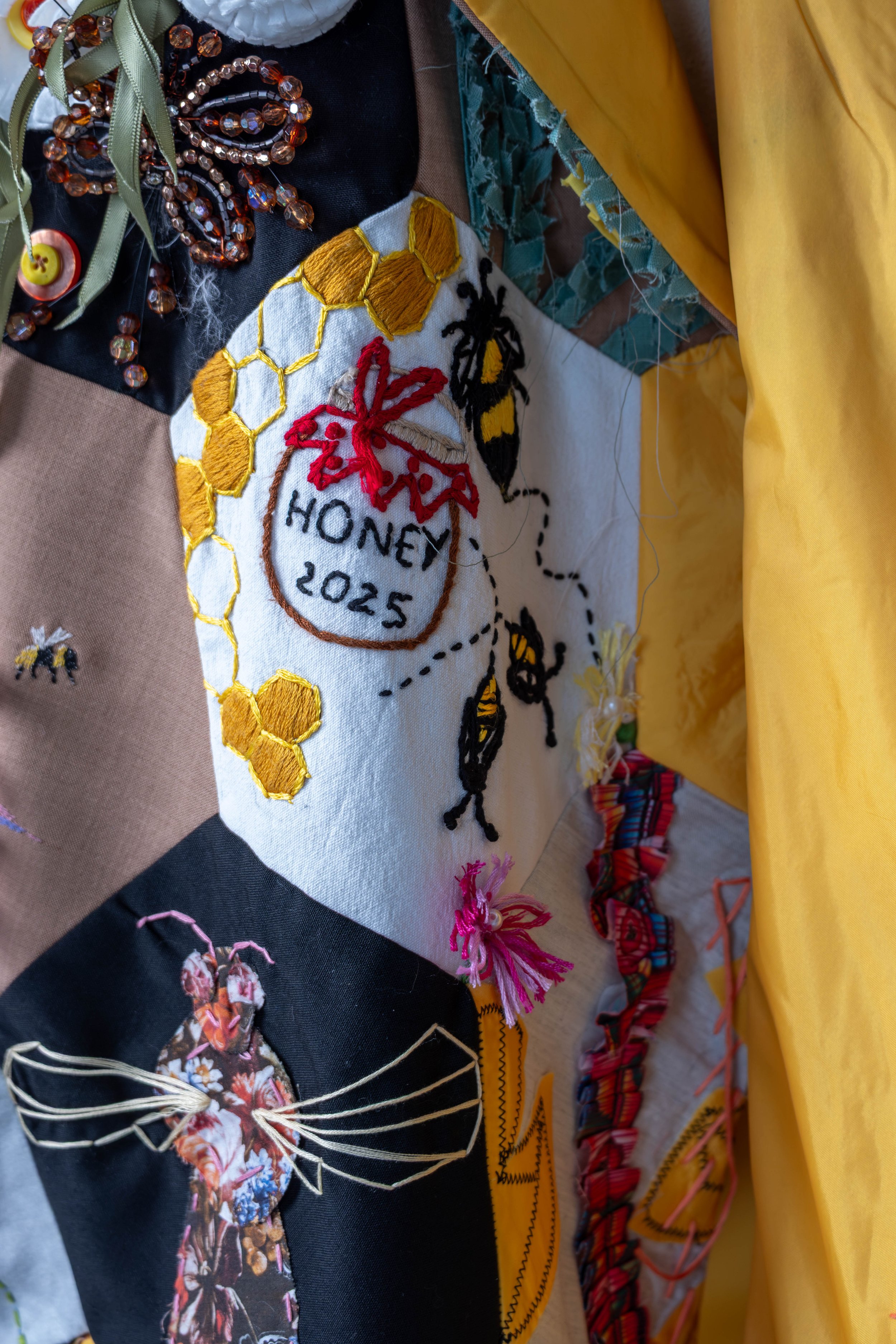 Threads of Nectar is the latest in our series of community made garments, exploring the lifecycle of bees through hexagonal patches. The use of golds and yellows, combined with the intertwined handwoven patchwork of bee imagery evokes the lifecycle of bee and the rich colours of honey.