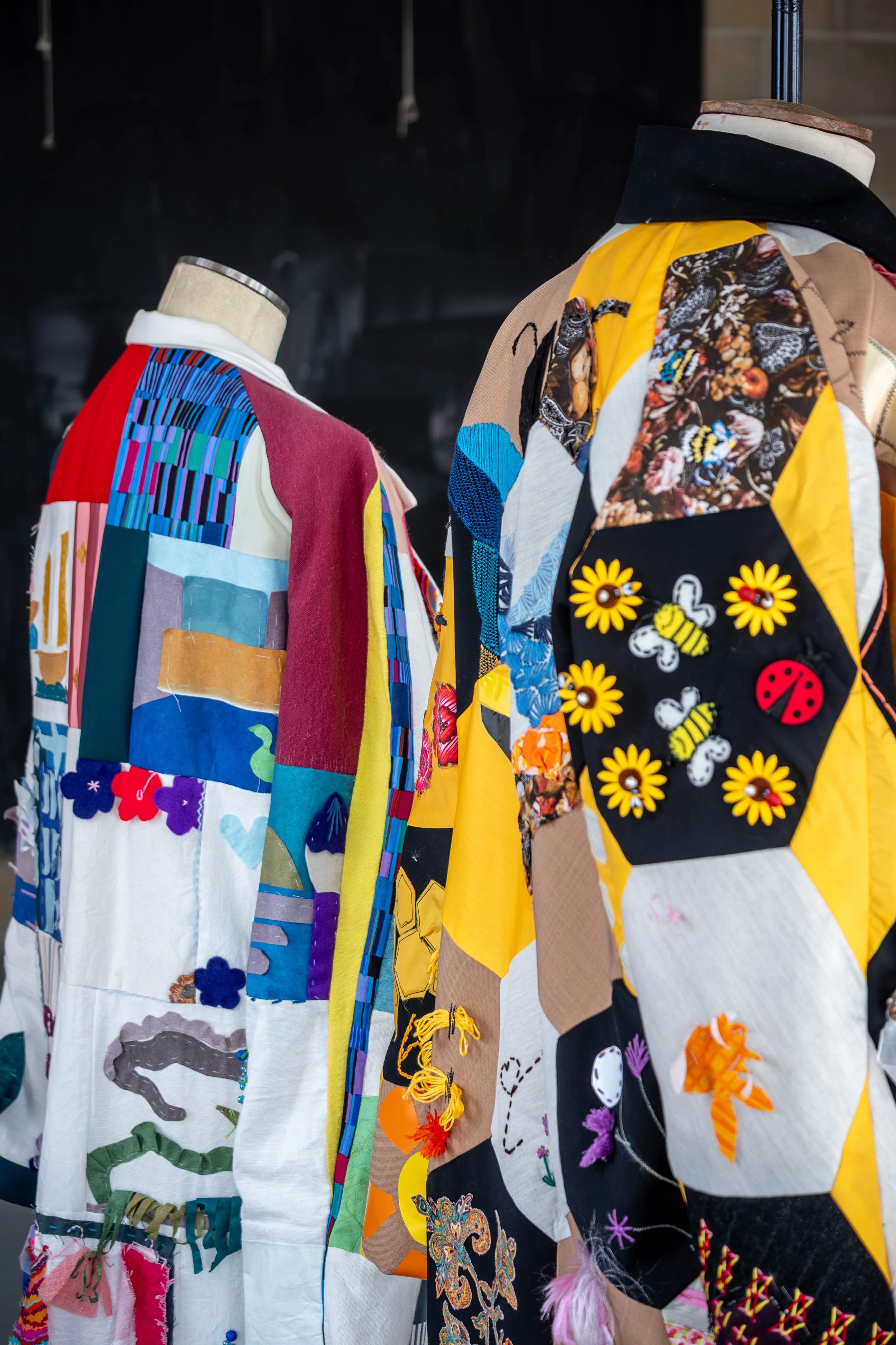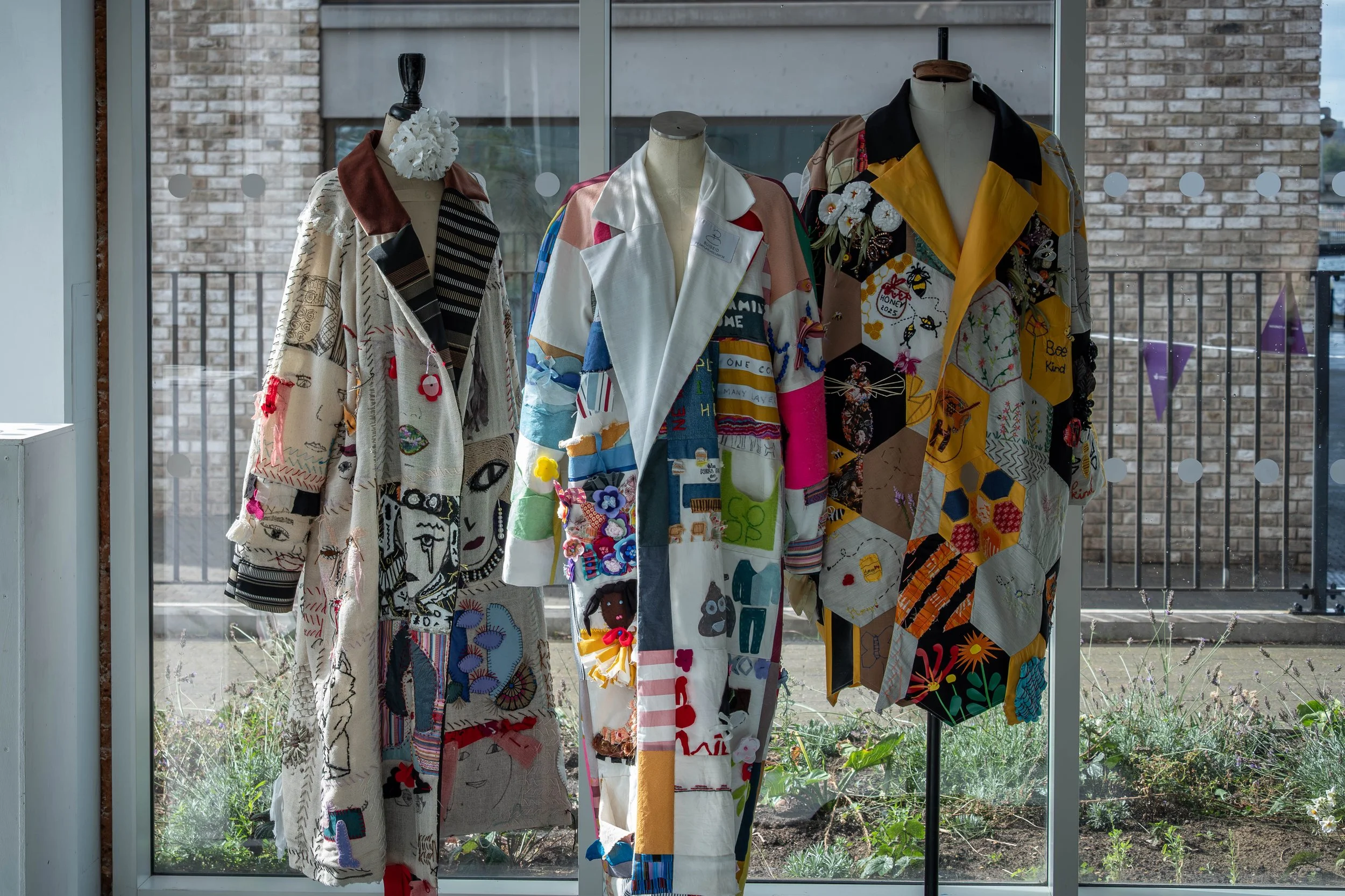 Our ‘Cento’ range of community coats are hand-crafted, wearable artworks made collectively by docklands residents. They are created from individual patches, each one hand worked by a local community member. Through their design, these coats tell stories that resonate with the local community and the events that shape their lives. Participants contribute drawings, words, patterns, symbols, and textiles reflecting personal memories, shared histories, and hopes for the future. These ideas are then stitched, painted, printed, and layered onto the coats, turning them into rich, tactile story-objects rather than conventional garments.