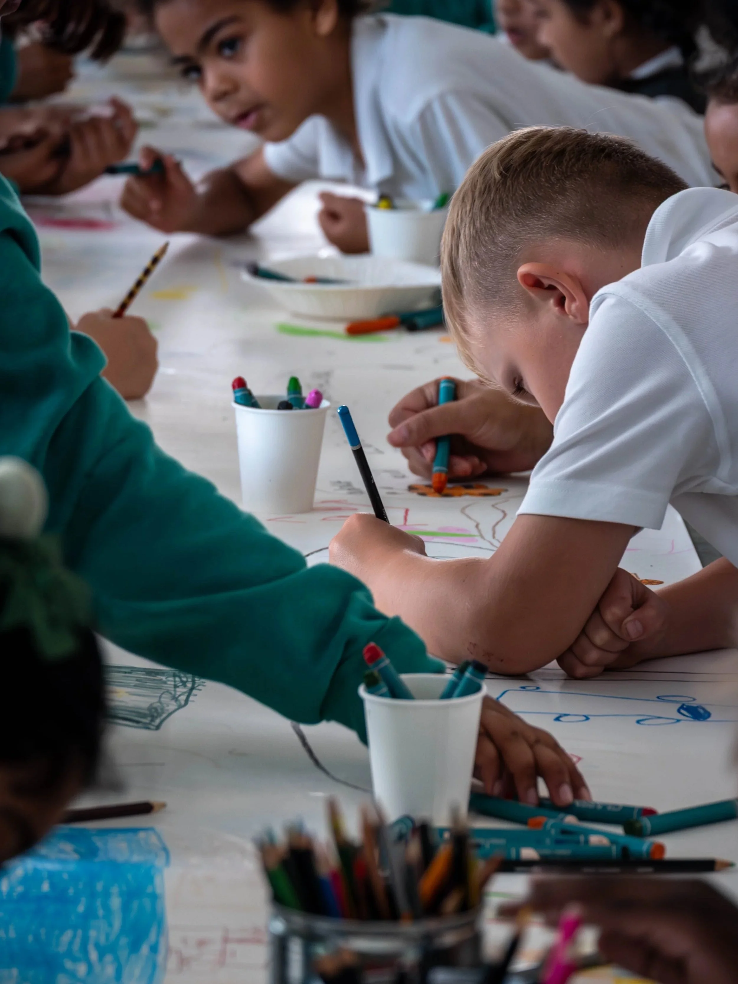 Art in the Docks works with schools to bring creative workshops, wellbeing activities, and participatory arts projects into the classroom. Students explore visual arts, performance, and collaborative making while developing confidence, teamwork, and self-expression.